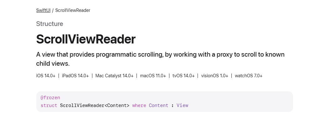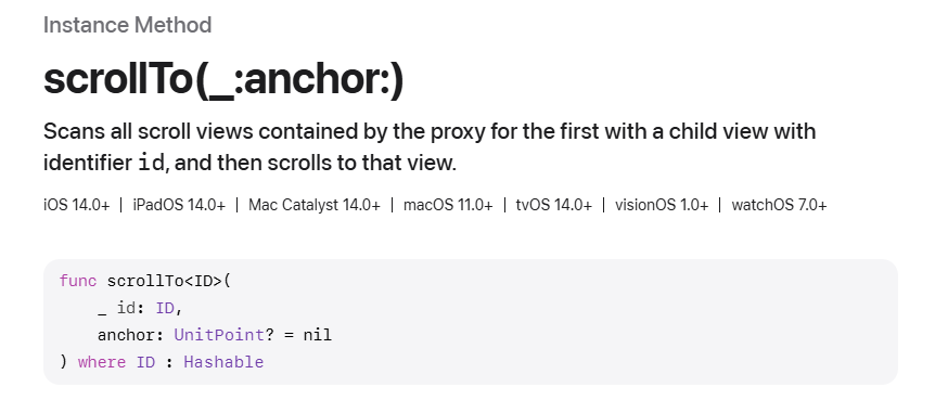 마찬가지로 iOS 14.0+에서 추가되었으며 ScrollViewReader 내에서 제공되는 프로토콜로, 사용자의 입력 없이도 ScrollView 내부의 특정 요소로 프로그래밍적 스크롤을 가능하게 합니다.